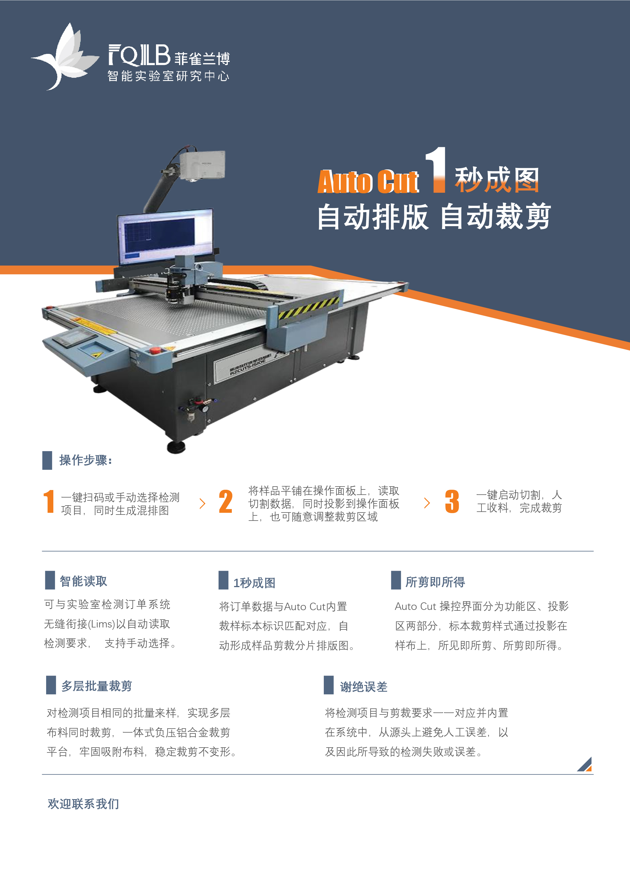 面向纺织品、鞋包等检测实验室样品裁剪需求,将检测标准、要求与样品裁剪标本标识一一对应,形成业务模型和(Auto Cut)数据工作流,实现样品剪裁自动化、智能化的软、硬件一体解决方案。